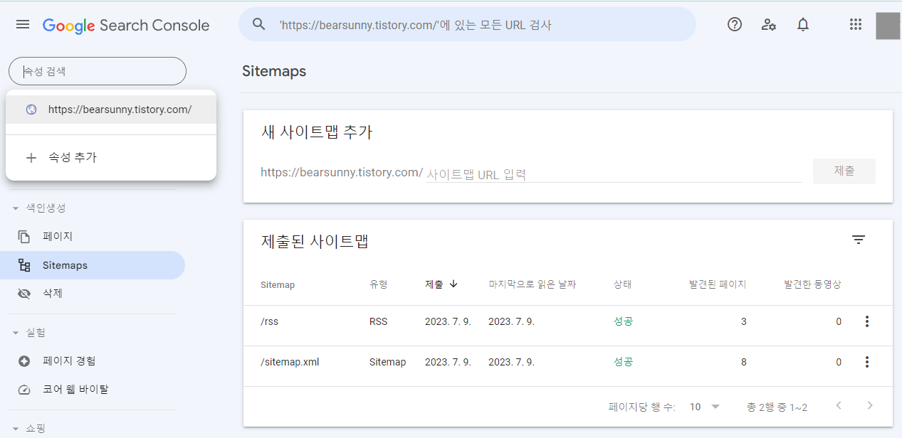 등록된 내 블로그를 선택한 뒤 Sitemaps를 클릭하고 사이트맵 추가 작업한다. 내 블로그 URL 표시가 되어 있으니 '/rss'를 입력하고 제출하기. '/sitemap.xml'를 입력하고 제출하기. 초록색으로 '성공'이라고 뜨면 잘 되었다는 뜻이다.